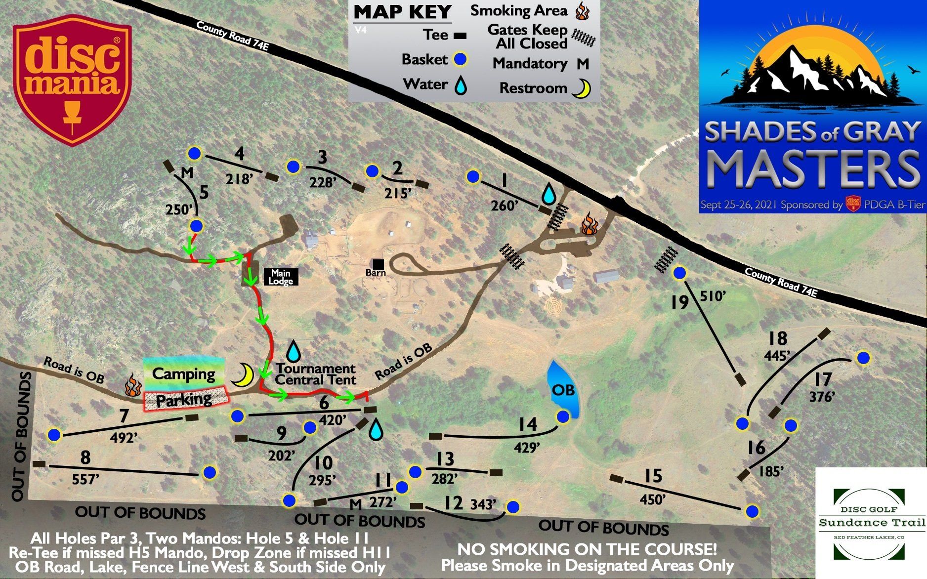 Special masters considerate mountain course in the gorgeous northern Colorado mountains. If you're familiar with the normal Sundance course, we are not playing 17 or 18, and have designed a new less challenging mountain climbing route for holes 5-8. This is still a mountain course with worn-in tee pads and raw ranch land with holes and rough spots. So please wear sturdy footwear and drink plenty of water. There will be 3 water stations throughout the course.