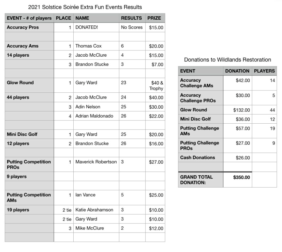 Extra Fun Events Results and final donation total to Wildlands Restoration Volunteers posted.