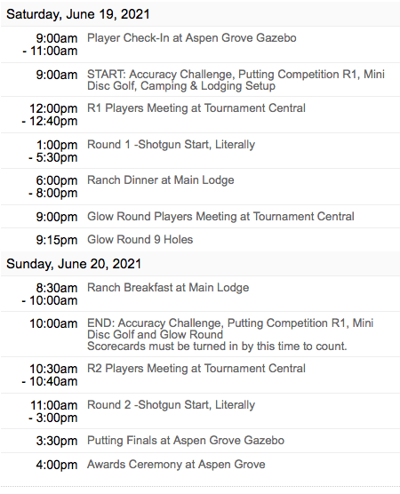 As always in an effort to help grow the sport, all women and junior divisions get to register a week earlier than everyone else. Each tournament entry fee includes $10 greens fees and $15 dinner Saturday evening. Everyone can register one-entry to any or all extra fun events during online registration. Tournament rounds and the Glow round will be scheduled but all other extra fun events are to be played on your own time. The Putting Competition will be 2 rounds with first round being Saturday and the finals being played out immediately following the second round, before the award ceremony. All extra fun events scorecards must be turned in before 10:00am Sunday morning to count.