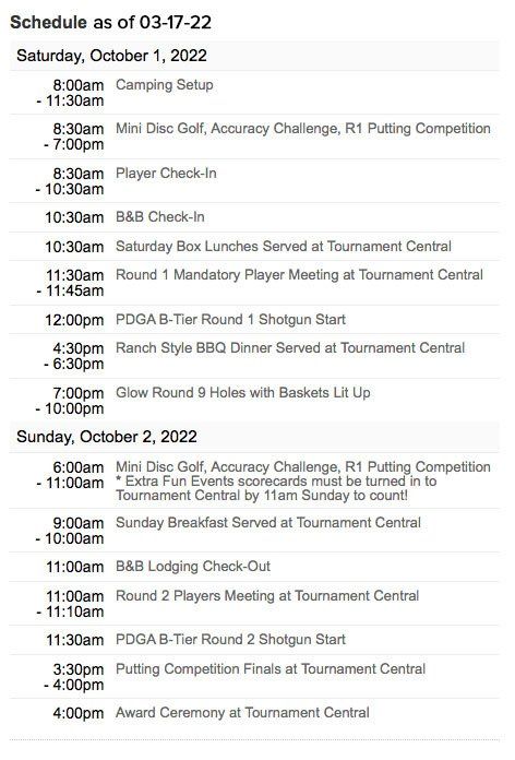 In addition to the two-round PDGA B-Tier sanctioned disc golf tournament, extra fun Putting Competition, Glow Round and Accuracy Challenge events plus a 9-Hole Mini Disc Golf Course will be available to play at your own pace all weekend long with half of those entry fees going to charity. The Putting Competition is actually two rounds with a finals round just after the Sunday PDGA B-Tier round, just before the awards ceremony.