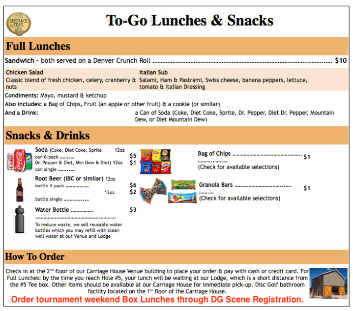 Everyone gets a hearty ranch style dinner Saturday evening included in their tournament entry fee after hiking around the mountain all day. Breakfast is included in the bed & breakfast lodging option and is an option for campers too. Additional dinners and breakfasts can be purchased for friends or caddy's as well. Two kinds of sandwich Box Lunches including sandwich/ chips/ fruit/ desert/ soda are also available for both days. Saturdays lunch is scheduled to be served before Saturday's round and after Sunday's round. All extra food and lodging are managed and paid through the DG Scene registration.