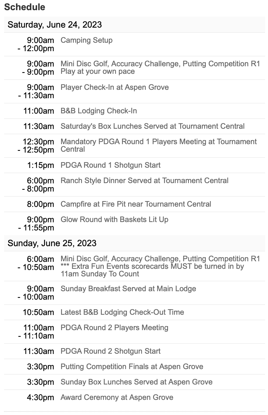 PDGA sanctioned B-Tier will be one-round per day, starting at 1:15pm MST with a literal shotgun start. Number of holes played is still TBD. Junior divisions will play a much smaller course used for the glow round. This is a mountain course with a great mix of tight wooded holes and wide open drives. It is all raw ranch land and mountain terrain with natural tees with beautiful Colorado views. Recommend sunscreen, drinking lots of water and good supportive footwear. There will be a couple small oxygen bottles available for those coming up from sea level. Three water jugs will be available on the course at holes 1, 7 and 15 and one at tournament central. Most divisions offered upon registration opening, but may consolidate divisions closer to the event with permissions from everyone involved. Please read and understand the refund/cancelation policy before registering; it's exactly the same as the the PDGA rules. True Amateur event with large players pack & trophies for the top finishers for the amateur divisions and $750 minimum added pro cash. All player registrations include the following pass-through fees: $3 PDGA Player Fee, $10 Greens Fees, $4 Porta-Potty Rental. Saturday morning player check-in and the Sunday afternoon putting finals and award ceremony will be at the Aspen Grove carriage house building near the highway. Everything else during the weekend will be at tournament central, near the fire pit / lodging / camping.