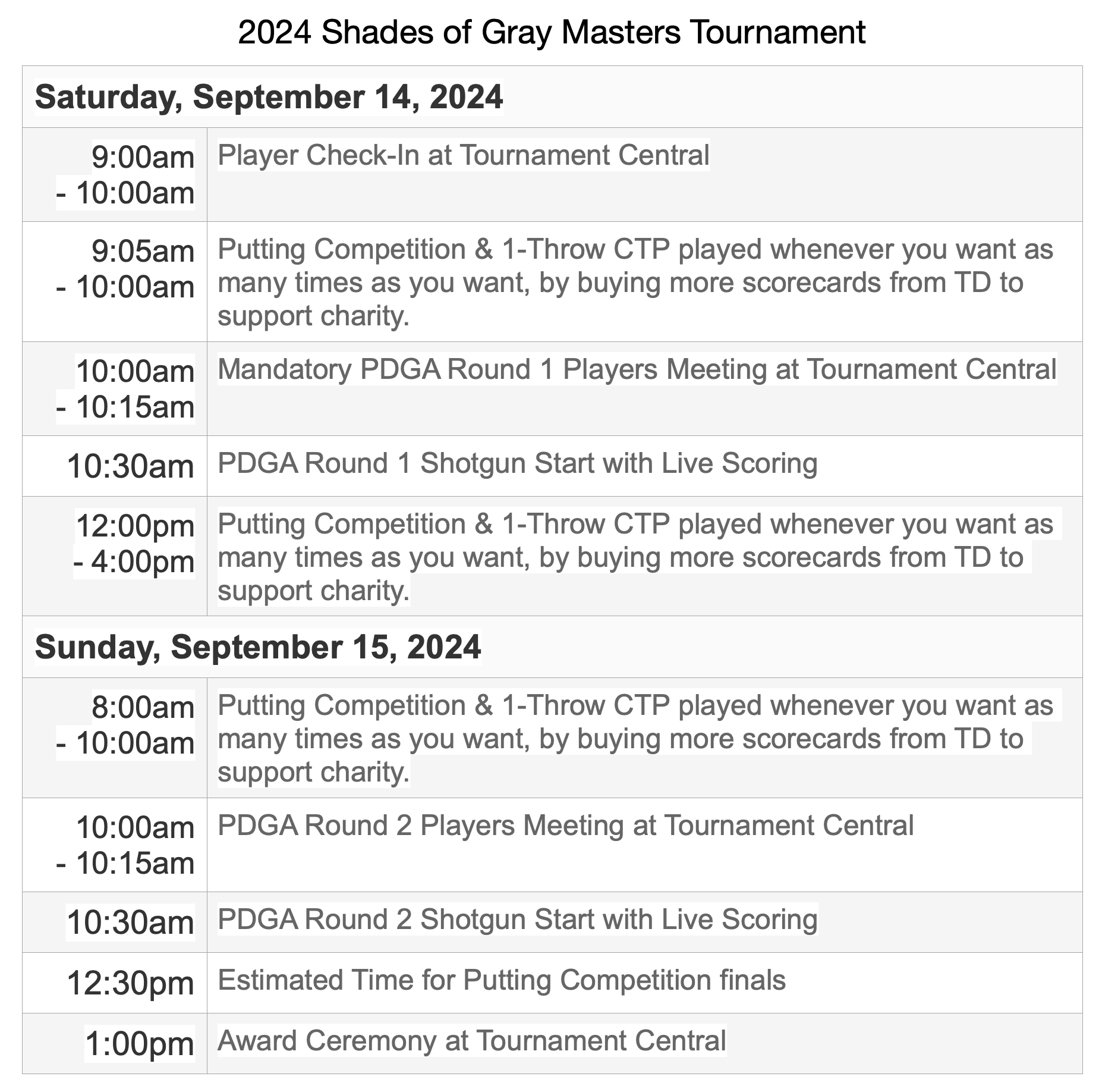 The Putting Competition and One-Throw CTP extra fun events can be played anytime before or after Saturdays round, or Sunday morning before the second round. But all extra fun event scorecards MUST be turned by the Sunday 2nd round players meeting to count. Half of the extra fun event entry fees will be cash payout and the other half will be donated to the official tournament charity, the Paul McBeth Foundation.