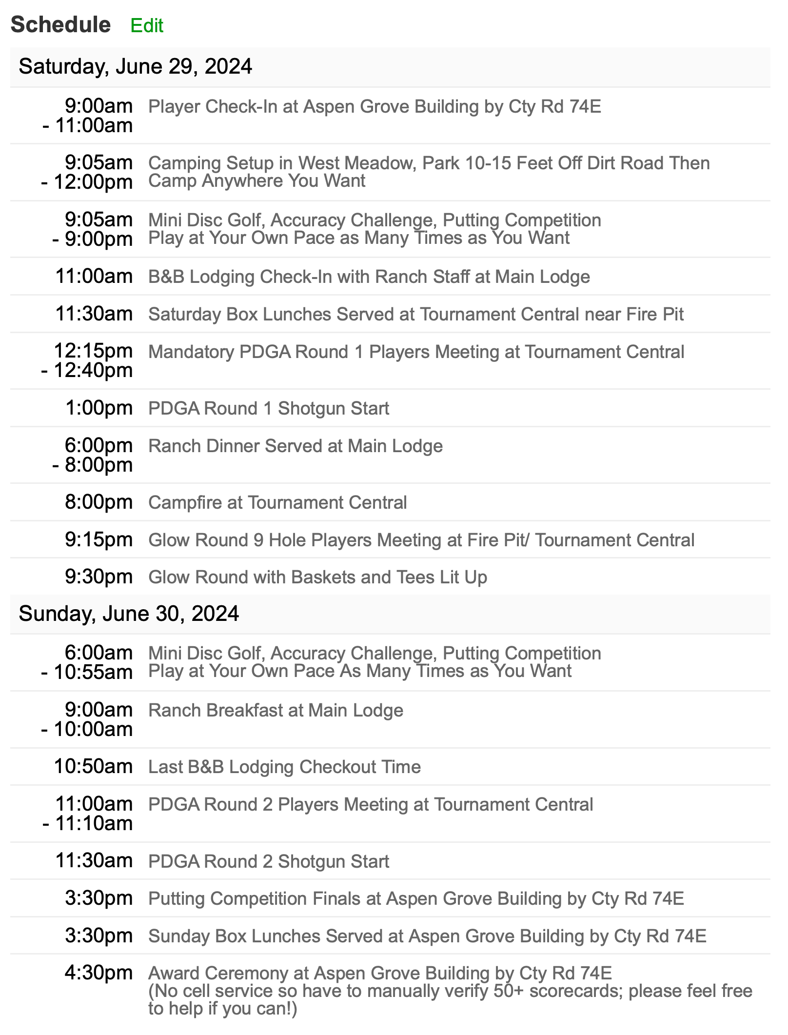 PDGA sanctioned B-Tier will be one-round per day, starting at 1:15pm MST with a literal shotgun start. Number of holes played is still TBD. Junior divisions will play a much smaller course used for the glow round. This is a mountain course with a great mix of tight wooded holes and wide open drives. It is all raw ranch land and mountain terrain with natural tees with beautiful Colorado views. Recommend sunscreen, drinking lots of water and good supportive footwear. There will be a couple small oxygen bottles available for those coming up from sea level. Three water jugs will be available on the course at holes 1, 7 and 15 and one at tournament central. Most divisions offered upon registration opening, but may consolidate divisions closer to the event with permissions from everyone involved. Please read and understand the refund/cancelation policy before registering; it's exactly the same as the the PDGA rules. True Amateur event with large players pack & trophies for the top finishers for the amateur divisions and $750 minimum added pro cash. All player registrations include the following pass-through fees: $3 PDGA Player Fee, $10 Greens Fees, $4 Porta-Potty Rental, $3 TD fee. Saturday morning player check-in and the Sunday afternoon putting finals and award ceremony will be at the Aspen Grove carriage house building near the highway. Everything else during the weekend will be at tournament central, near the fire pit / lodging / camping.
