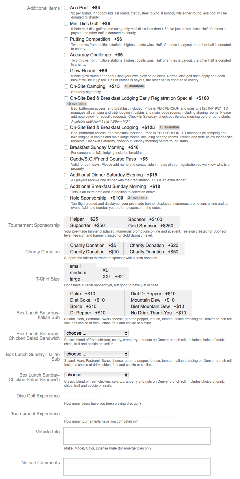 There are three tiers of early registration for all three events. All Women and Junior divisions get a week of early registration before everyone else, so they can get in and play if they want. The following week is early registration for B&B lodging at a discounted rate and also tournament help early registration at a discounted rate in exchange for an hour or so of work before and after each round. Please contact the TD if interested in helping for a discounted entry fee at matt@peacejames.co. The last week of early registration is for Hole Sponsors at $100 and Tournament Sponsors at multiple tiers from $25 to $250.
