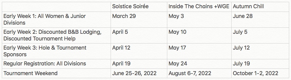 Here are the registration dates to put into your calendars for all three 2022 tournaments.