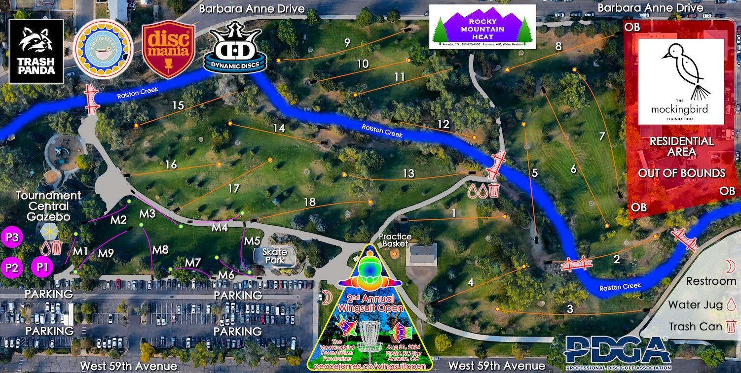 2nd annual Wingsuit Open is a charity fundraiser for The Mockingbird Foundation who supports music education and access for children. Celebrating the music of Phish when they’re in town at Dicks Sporting Goods Park this event is open to beginners and experienced players alike. Sanctioned as an official PDGA Competition Endowment Program tournament XC-tier, playing one round of 18 holes with your choice of tee time segment at the Johnny Roberts Memorial disc golf course in Arvada, which was recently named a 5280 Magazine 2023 Reader’s Choice as the best disc golf course in Denver.